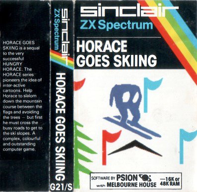 Horace Goes Skiing [computer game]. Horace Goes Skiing is a single player game with multiple genres. The first is similar to Frogger, where players begin with $40 and guide Horace across a busy road to the ski lodge. Getting hit by a vehicle costs Horace $10 in ambulance fees. Once Horace makes it to the lodge and hires skiis, it becomes a ski game where players slalom between flags and avoid trees. Colliding with a tree will send Horace back to the start of the game. When Horace runs out of money, the game ends.