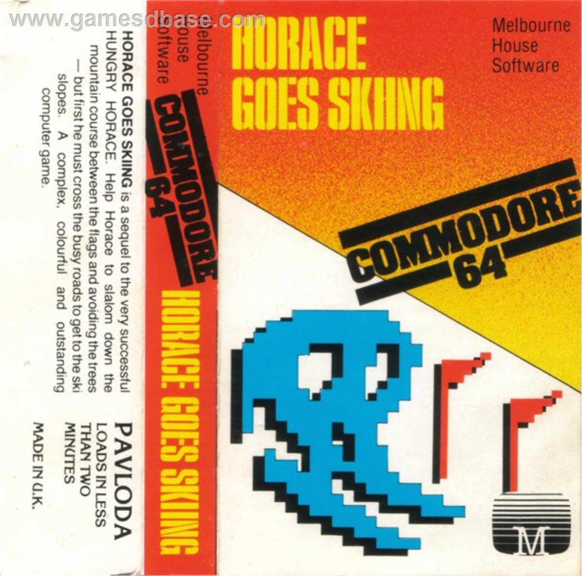 Horace Goes Skiing is a single player game with multiple genres. The first is similar to Frogger, where players begin with $40 and guide Horace across a busy road to the ski lodge. Getting hit by a vehicle costs Horace $10 in ambulance fees. Once Horace makes it to the lodge and hires skis, it becomes a ski game where players slalom between flags and avoid trees. Colliding with a tree will send Horace back to the start of the game. When Horace runs out of money, the game ends.