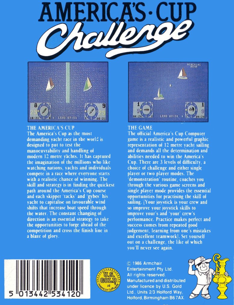 America’s Cup Challenge is a one to two player competitive sports simulation. The included manual contains a lot of information about the America’s Cup including yachting terminology, race legs, wind angles, sails and weather conditions. The player controls the crew of a racing yacht using the joystick, chosing the type of sail at the start of the race and then switching between three different modes, helmsman, sails selection and winching. As Helmsman, players control the yacht’s direction. Sail selection allows players to move the angle of the sail’s boom and the level of use of the spinnaker or genoa. The manual advises the use of a good quality robust joystick.