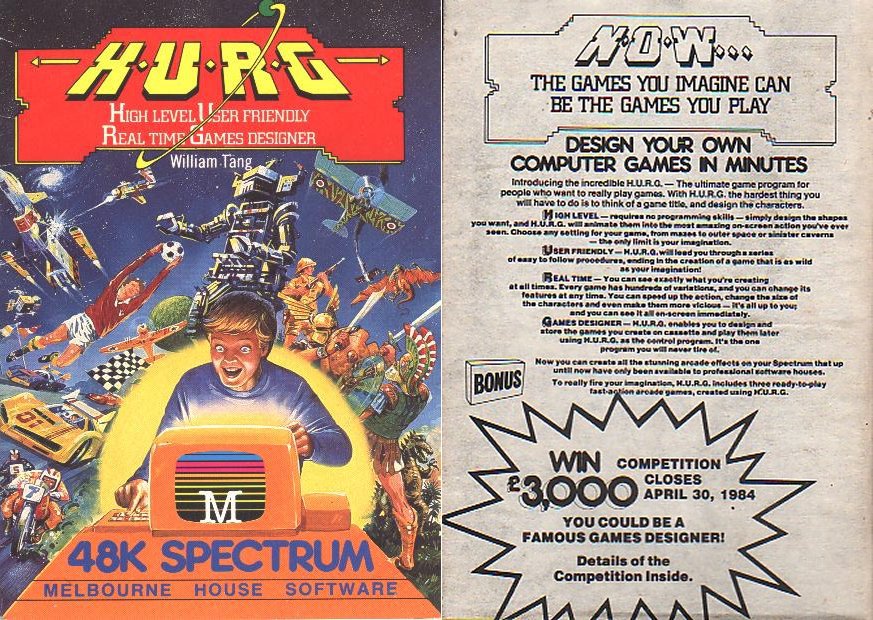 “H.U.R.G., High-Level User-Friendly Real-Time Games Designer”, is a program that enables you to create games. It is a menu driven utility designed to assist in creating games for the ZX Spectrum 48K and can be used by those with little or no knowledge of programming. For example, by using the ‘Edit Game’ menu option, the player can select actions such as creating a title page or specifying playing conditions via sub-menus. Utilities like these opened the possibilities for using home computers, by making programming accessible to anyone who was interested. Games created with “H.U.R.G.” are not stand-alone; they still require the engine to run.