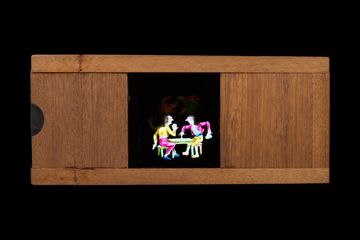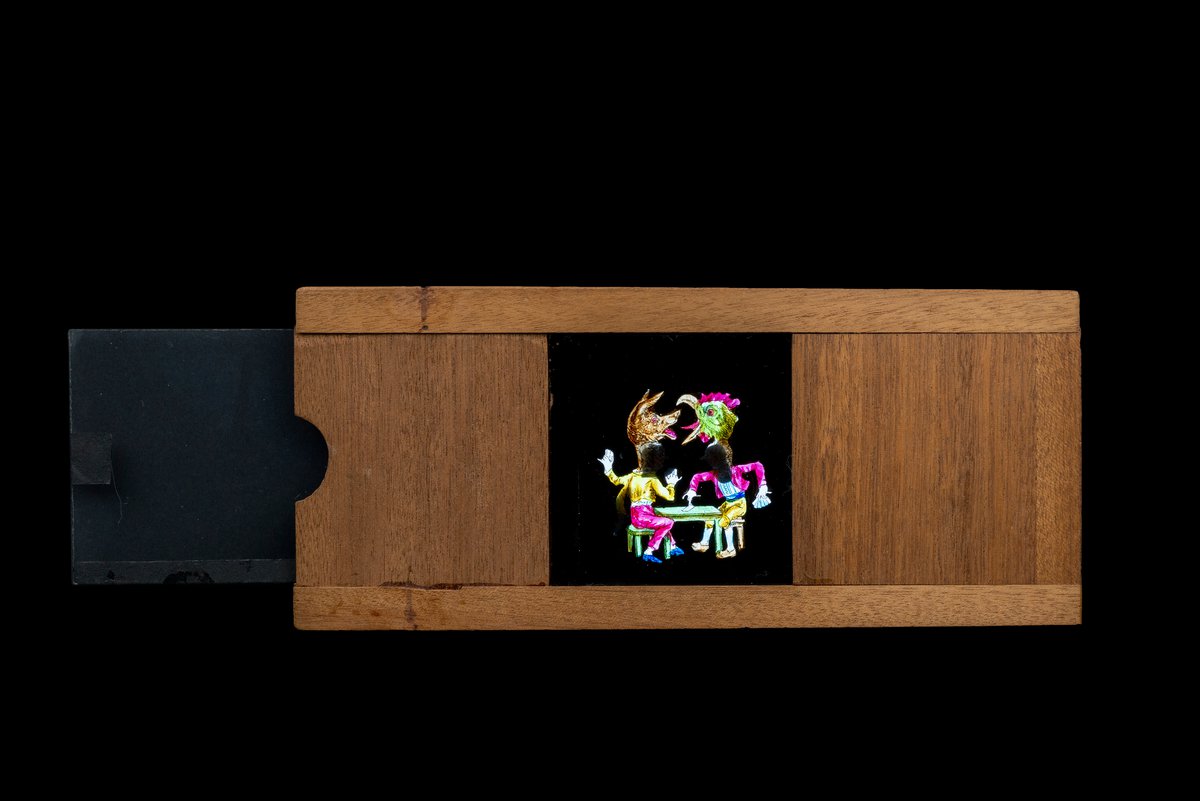 Hand painted magic lantern set effects slipping slide in wooden frame [Les Jouers de Cartes - the Card Players]. By sliding the effects slide, two card players’ heads turn in to a chicken (left) and a dog (right).