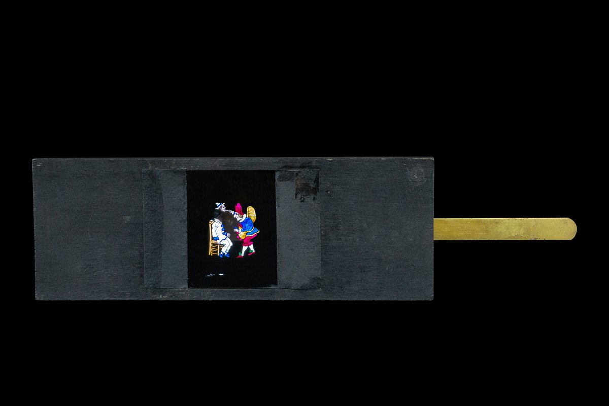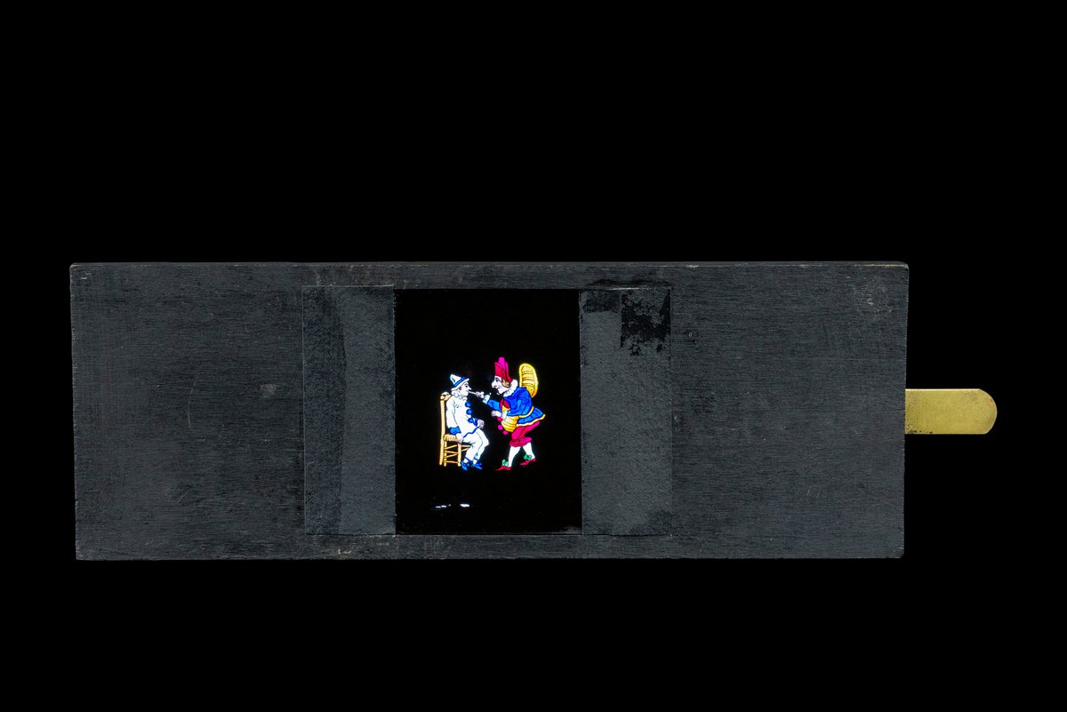 Hand painted Magic Lantern Set Effects slide with black wooden frame and metal parts[Polichinel Dentiste - Dentist Pulcinella / Punch]