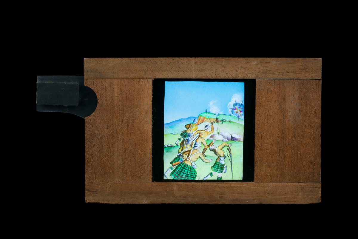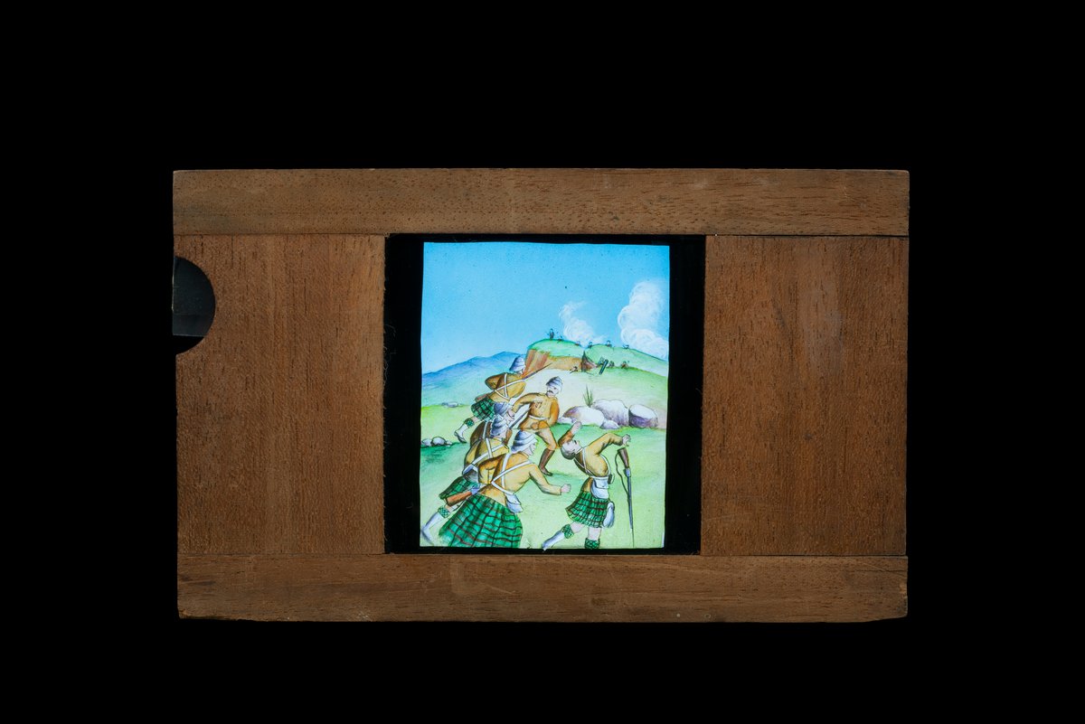 Handpainted magic Lantern wooden slipping slide with [Scottish Regiment Army] imagery. When the slide is moved, the armies battle.