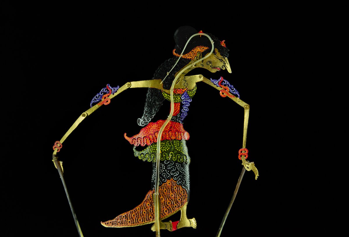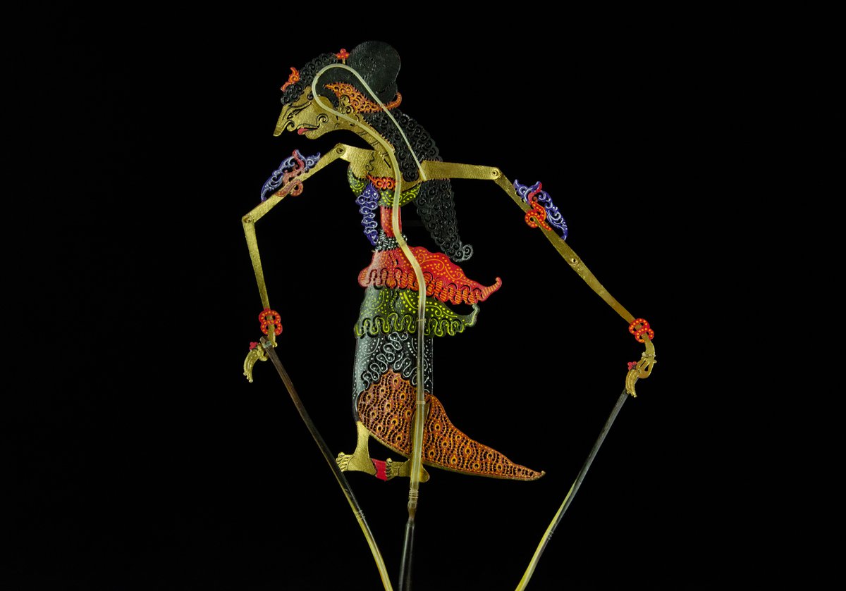 Wayang Kulit shadow puppets depicting a range of 2D character forms made from animal skin, with an attached central pole and two slender side poles made from ox horn. Puppets are painted with oil and gold paint depicitng details of facial features, head-dresses, jewellery and clothing in a range of bright colours, skin of characters is depicted in gold.