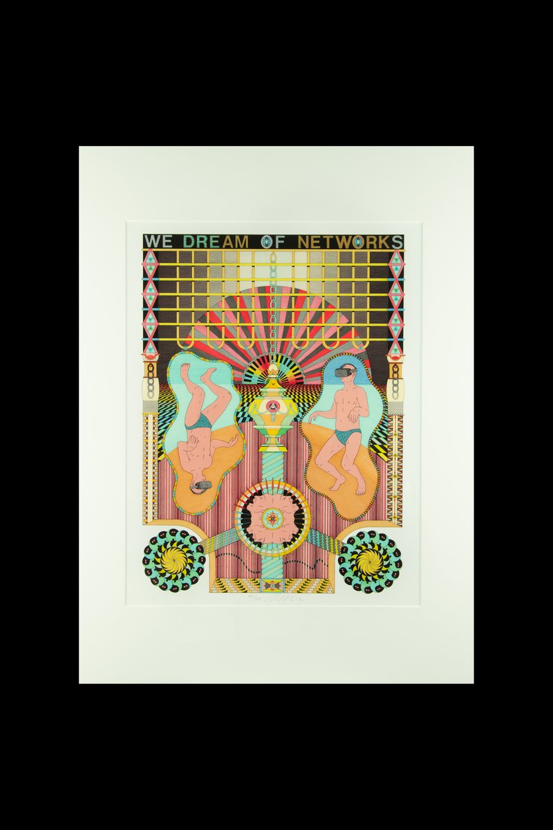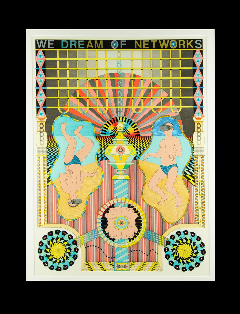 “My drawings are meshworks of cultural symbology, humanoid clones, messianic figures and alien runes placed in architectural settings. This practice feeds into installations and collaborations in animation, music, fashion, virtual reality and textile art. These additional mediums bring the world of my drawings into physical and virtual spaces, providing an immersive experience for audiences.” – Jess Johnson