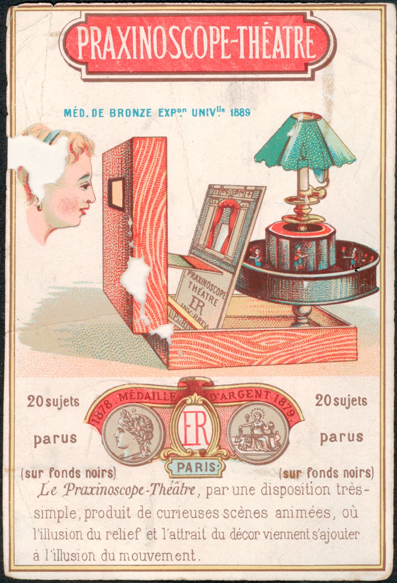 French inventor and magic lantern artist Charles-Émile Reynaud further developed his praxinoscope into a small theatre. The Praxinoscope Théâtre gave viewers the chance to mix a range of printed backgrounds and character reels to create more sophisticated animated scenes and stories.