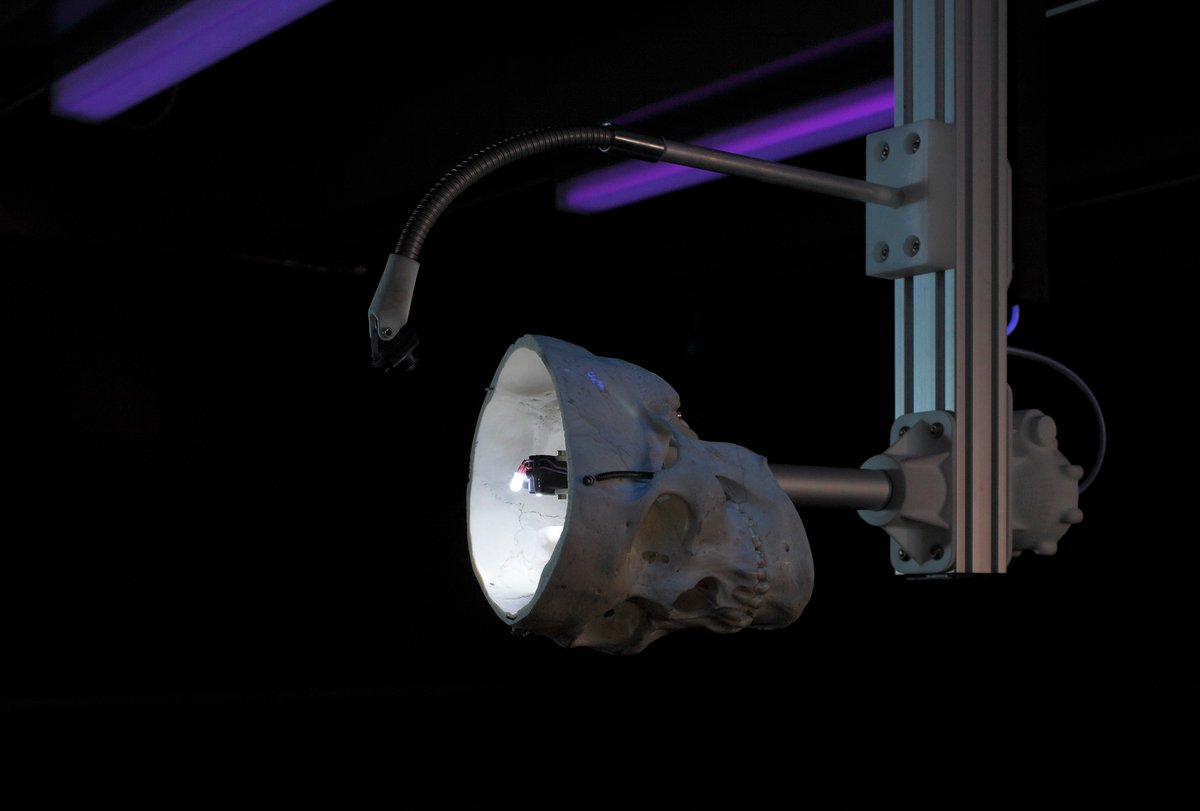Multi-channel installation, plastic skull, endoscopic cameras, mechanised mount, transformer, fog machine and projection