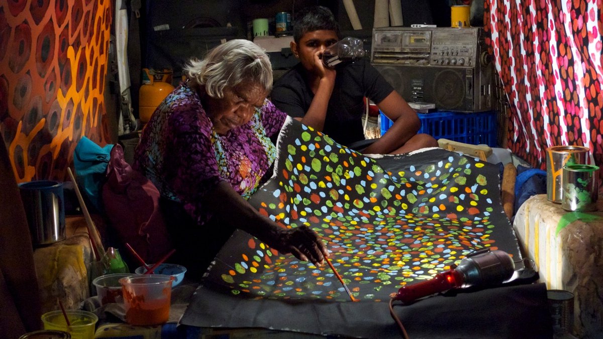 The installation comprises a white van housing a dual screen projection of an elderly Aboriginal woman artist and her grandson. Surrounded by paint pots, utensils and bedding, the woman (played by artist Grace Rubuntja) applies herself to her work, while the boy sits, bored, listening to loud Aboriginal rock music that blares out of a radio inside the van.