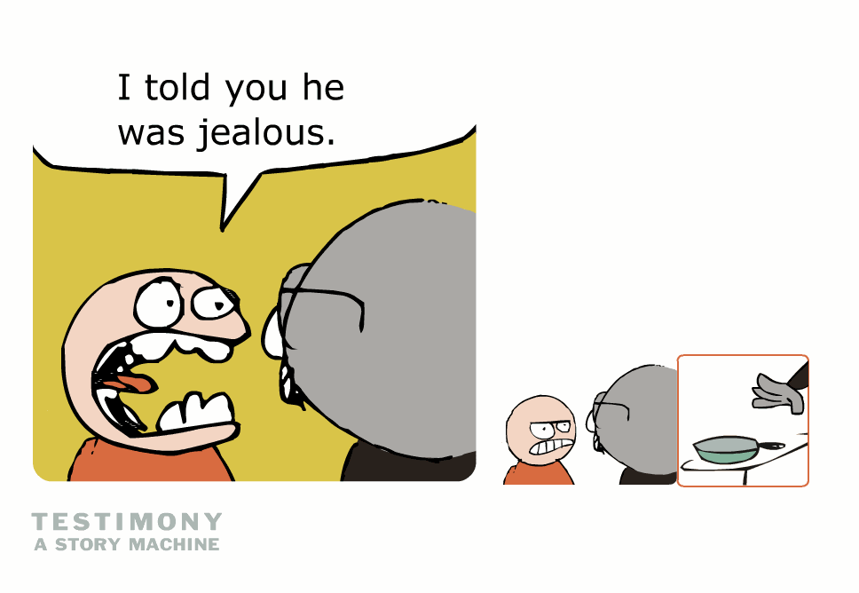 “Testimony: A Story Machine” is an interactive comic strip. It is a story to be played with. The user may click where s/he pleases, causing images to be replaced, or characters to animate and change position. By changing one image in a sequence of (say) four frames, the story implied by the sequence of four is altered, even when the other three frames remain static. The ideas for the project came from my previous experiments with cut-up collages of text and cut-up collages of comics, and also my interest in film and shot sequence and comics and frame sequence.