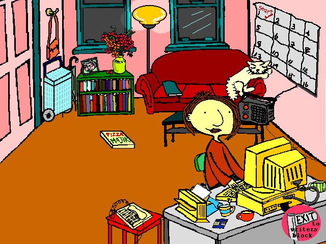 Writer’s block was developed as a character-driven interactive that gives the user the opportunity to view characters involved in the creative process of writing; including having trouble with muses and getting distracted by too many coffee breaks. The CDROM also contains practical information for would be authors ranging from getting started as a writer through to organising a poetry reading.