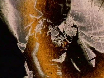 Two pieces of found footage were used to produce ‘Jumpcut’, a series of frames cut from the head and tails of various takes of a talking head shot for a 1970s industrial film or commercial; and a piece of 1950s/60s home movie footage depicting a jumping child interrupted by the perforation marks at the end of the reel. Both images are processed through the Cox Box. The loop of the jumping boy had developed, over time, a network of miniscule cracks in the emulsion which were further emphasised by the increased contrast of the processing and the slow motion.