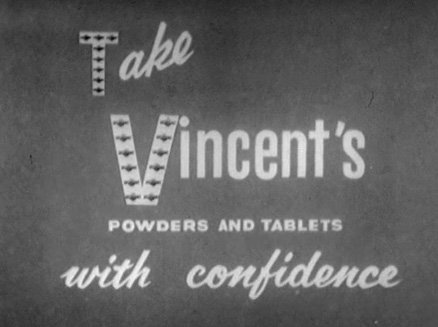 Television commercial for Vincent’s powders and tablets. ‘Take Vincents powders and tablets with confidence for headache and all pain’.