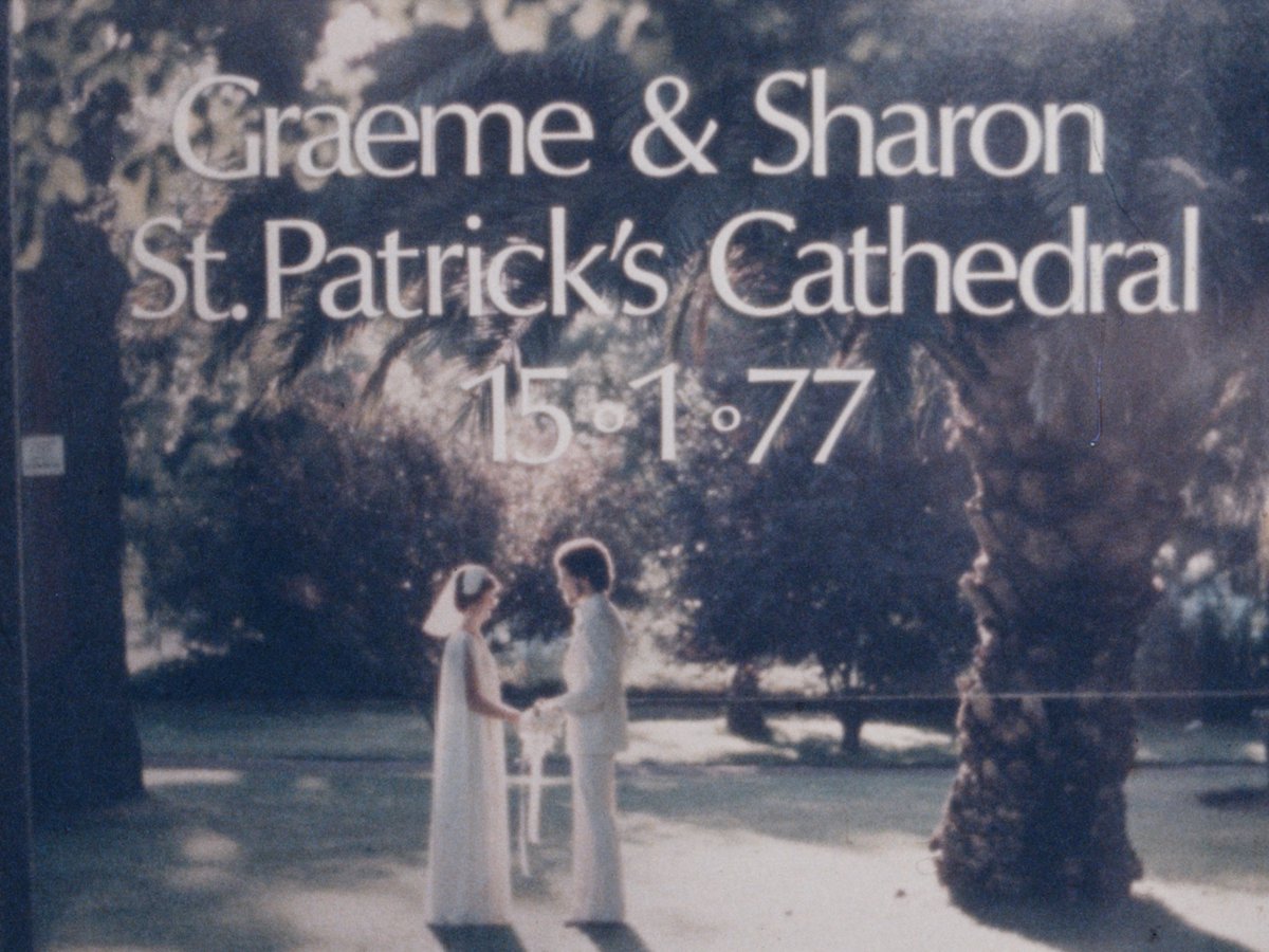 00:00:03:00 title card ‘Graeme & Sharon, St Patrick’s Cathedral, 15-1-77’