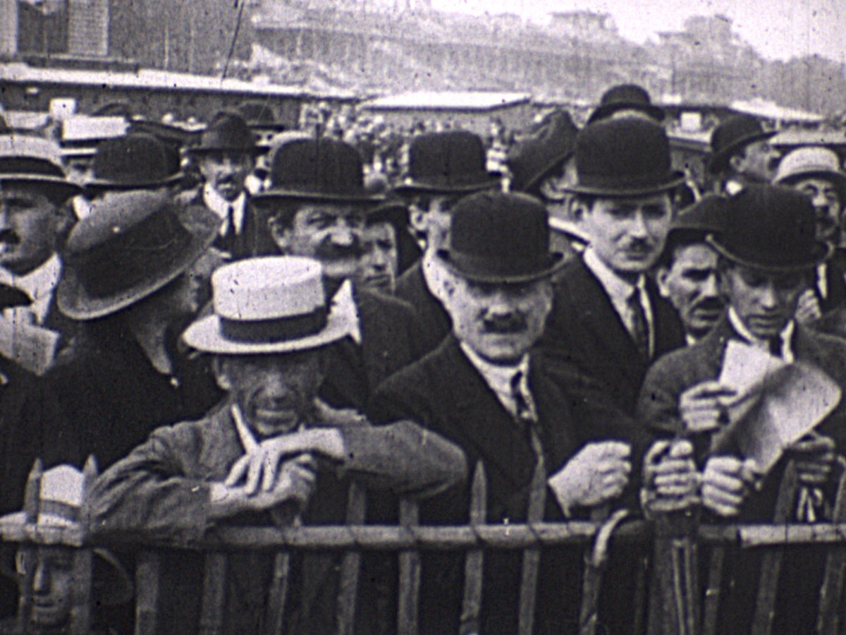 This short film, originally shot on 9.5mm film, shows a group of film competing in a wheelbarrow race (one person holding another’s ankles while they walk with their hands); running; collecting water in a pail; playing with dogs; rowing on a river or lake; and picnicking and lounging on the grass with 1920s cars behind. The film then shows people on a golfcourse and three women and a dog in the gardens of a large home.