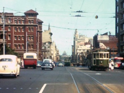 00:52:00:00 Melbourne street scene with vintage cars and tram #64. Facing south from the top end of Swanston Street.
