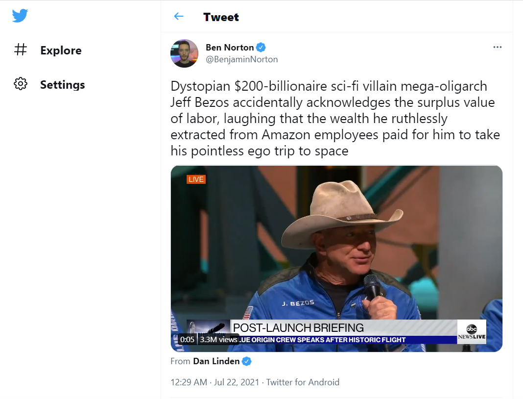 And the backlash isn’t only against the Amazon founder, but also Richard Branson and Elon Musk, billionaires jostling to beat each other into the stratosphere in a space race that exposes how massive corporations and individuals now possess the resources to do what was once reserved for Cold War superpowers. While Bezos timed the launch on the anniversary of the 1969 Moon landing, many Twitter users noted the disparity between that globally unifying moment and the disillusionment of watching a billionaire take an intergalactic joyride.