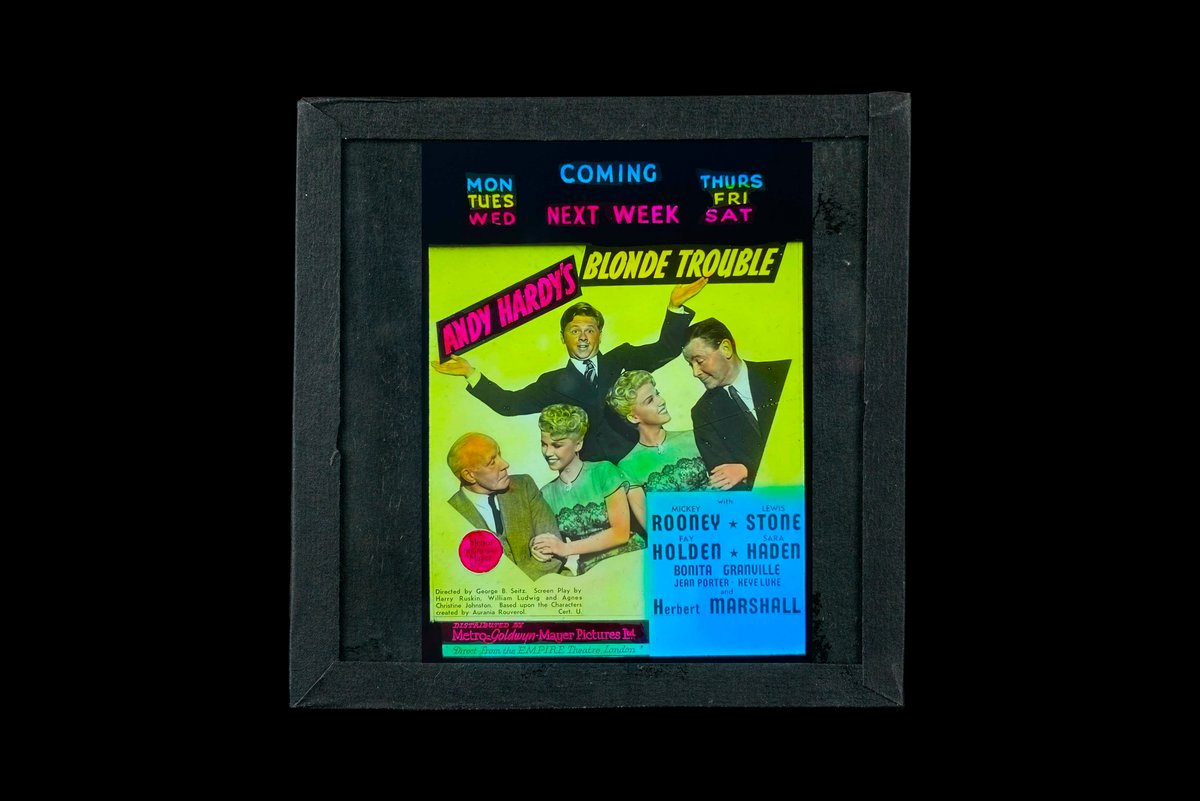 Glass Cinema lantern slide with black edging tape and internal black frame. This coloured slide is an advertisement for the film ‘Andy Hardy’s Blonde Trouble’ featuring Mickey Rooney distributed by Metro Goldwyn Mayer Pictures Ltd. Several pieces of light brown tape adhered to the top edge to cover cinema session details.