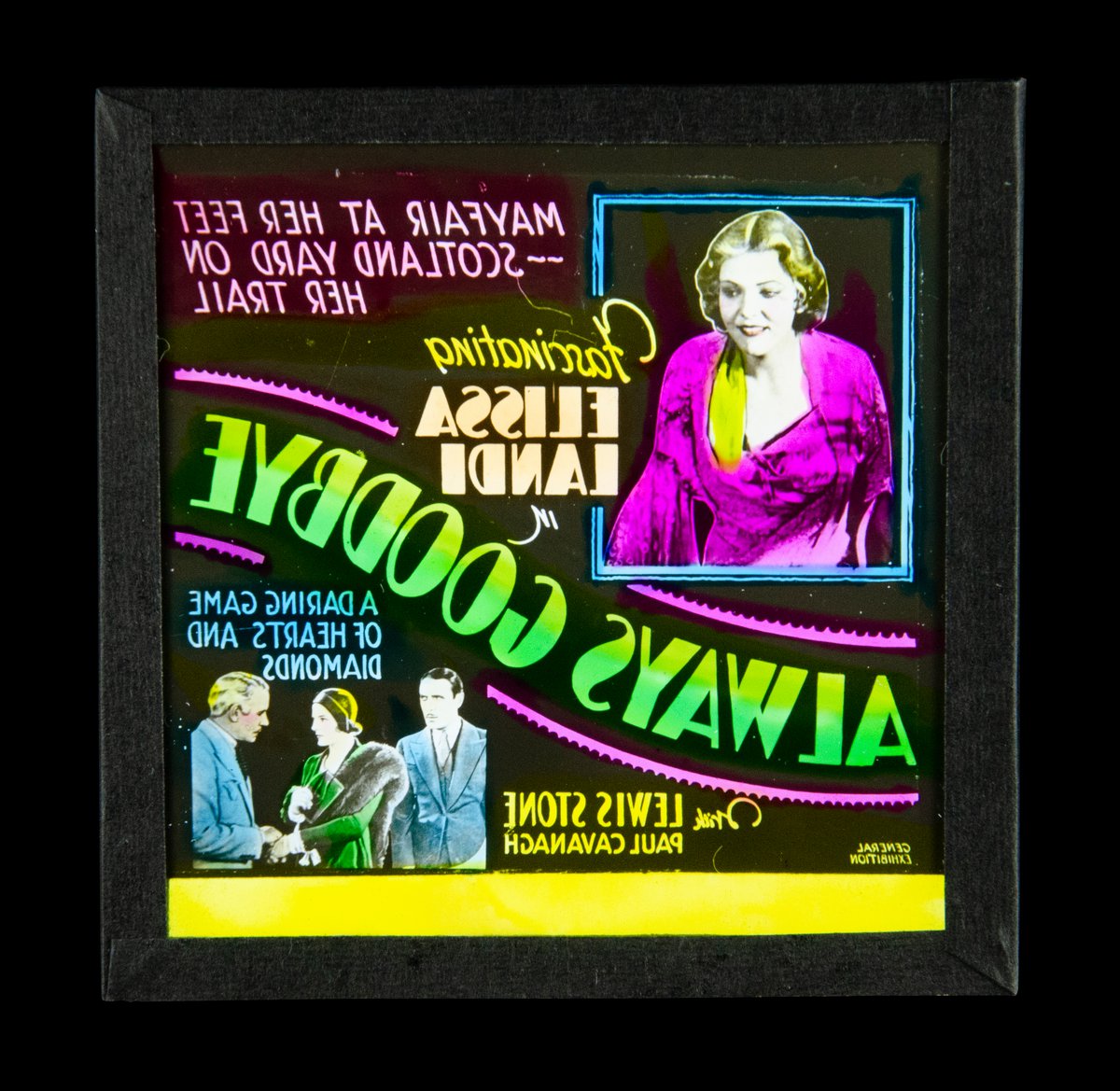 Two glass sheets (one with slide imagery. A monochromatic emulsion then hand painted with coloured pigments or dye) / the other sheet glass only. TEXT on the slide reads: Mayfair at her feet - Scotland Yard on her trail Fascinating Elissa Landi in Always Goodbye A daring game of hearts and diamonds with Lewis Stone Paul Cavanagh For General Exhibition