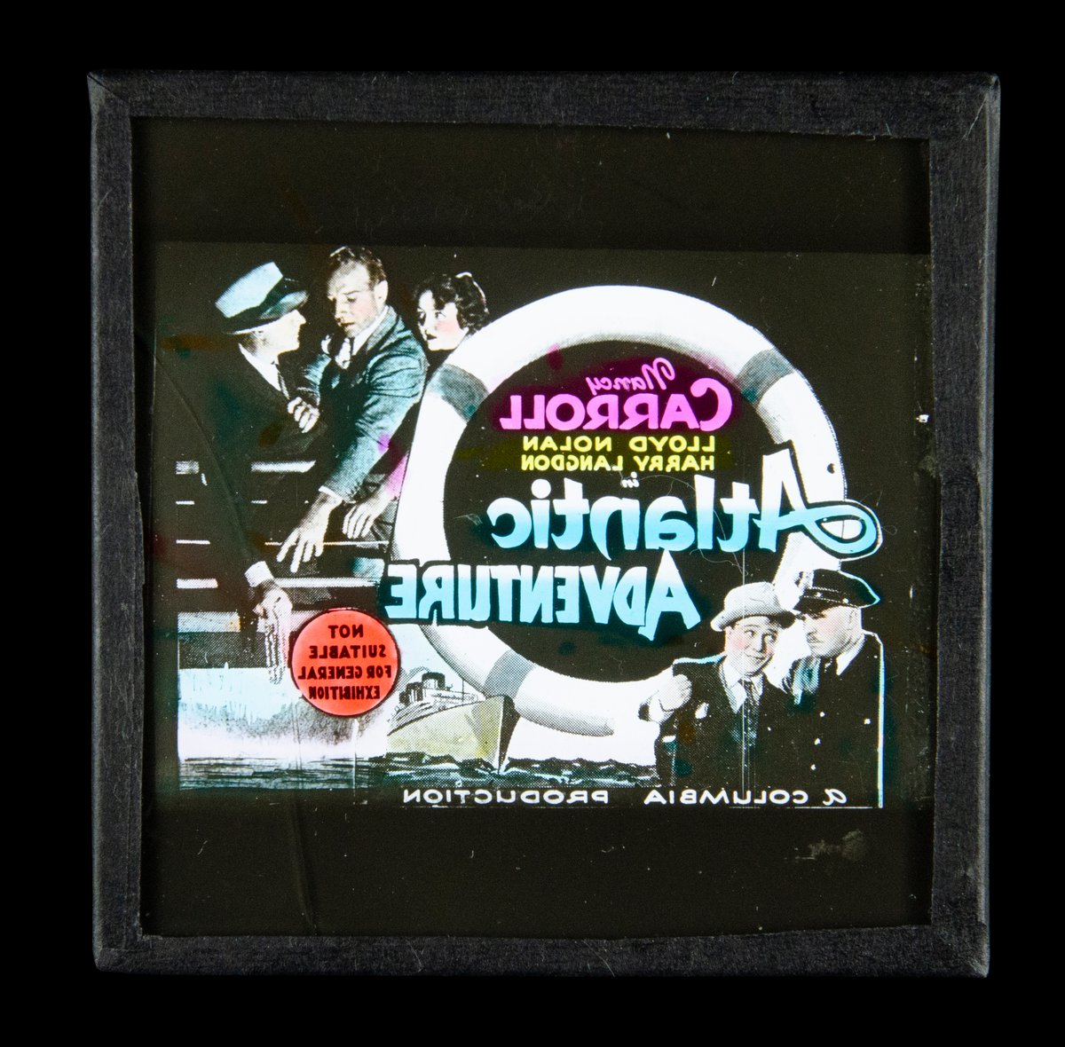 Two glass sheets: one glass only and the other with slide imagery which has a monochromatic emulsion that has then been hand painted with coloured pigments or dye. TEXT on the slide reads: Nancy Carroll Lloyd Nolan Harry Langdon in Atlantic Adventure Not suitable for General Exhibition. A Columbia production There is worn away black handwriting on the plain glass slide which says: Next Wed, Thurs, Fri
