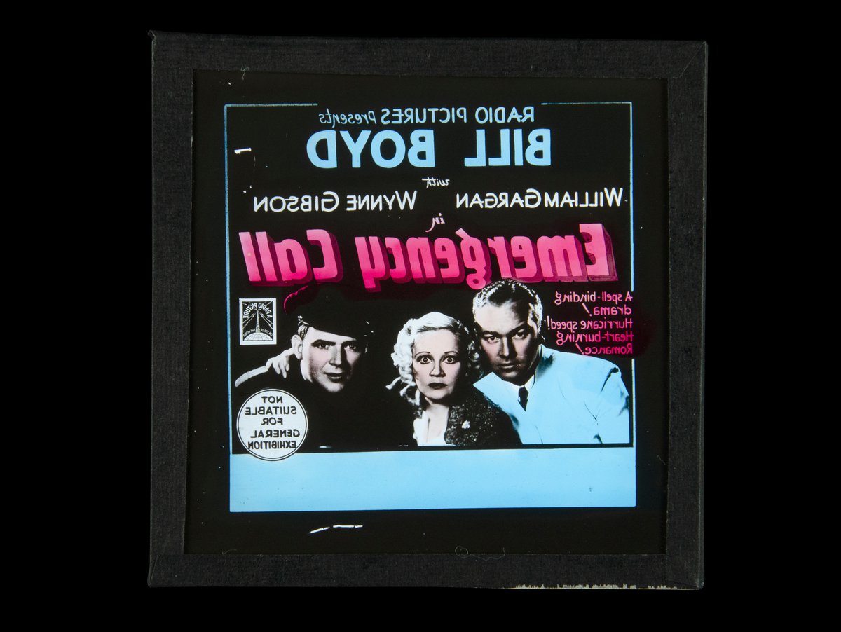 Slide features imagery with a monochromatic emulsion that has then been hand painted with coloured pigments or dye. TEXT on the slide reads: Radio Pictures presents Bill Boyd with William Gargen Wynne Gibson in Emergency Call A spell-binding drama! Hurricane Speed! Heart-burning Romance! A Radio Picture Not suitable for General Exhibition