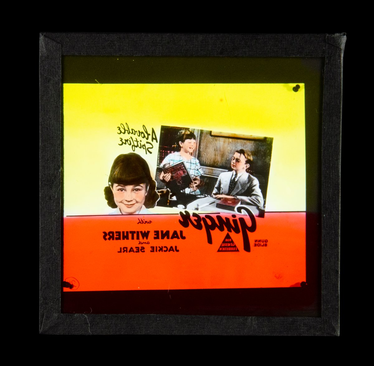 Two glass sheets: one glass only and the other with slide imagery which has a monochromatic emulsion that has then been hand painted with coloured pigments or dye. TEXT on the slide reads: A lovable Spitfire Ginger with Jane Withers and Jackie Searl Gunn Slide for General Exhibition The two sheets of glass are held together using Gunn’s Slide branded tape: Gunn’s Slide, 9 Collins Place Melb. Cent. 2736,