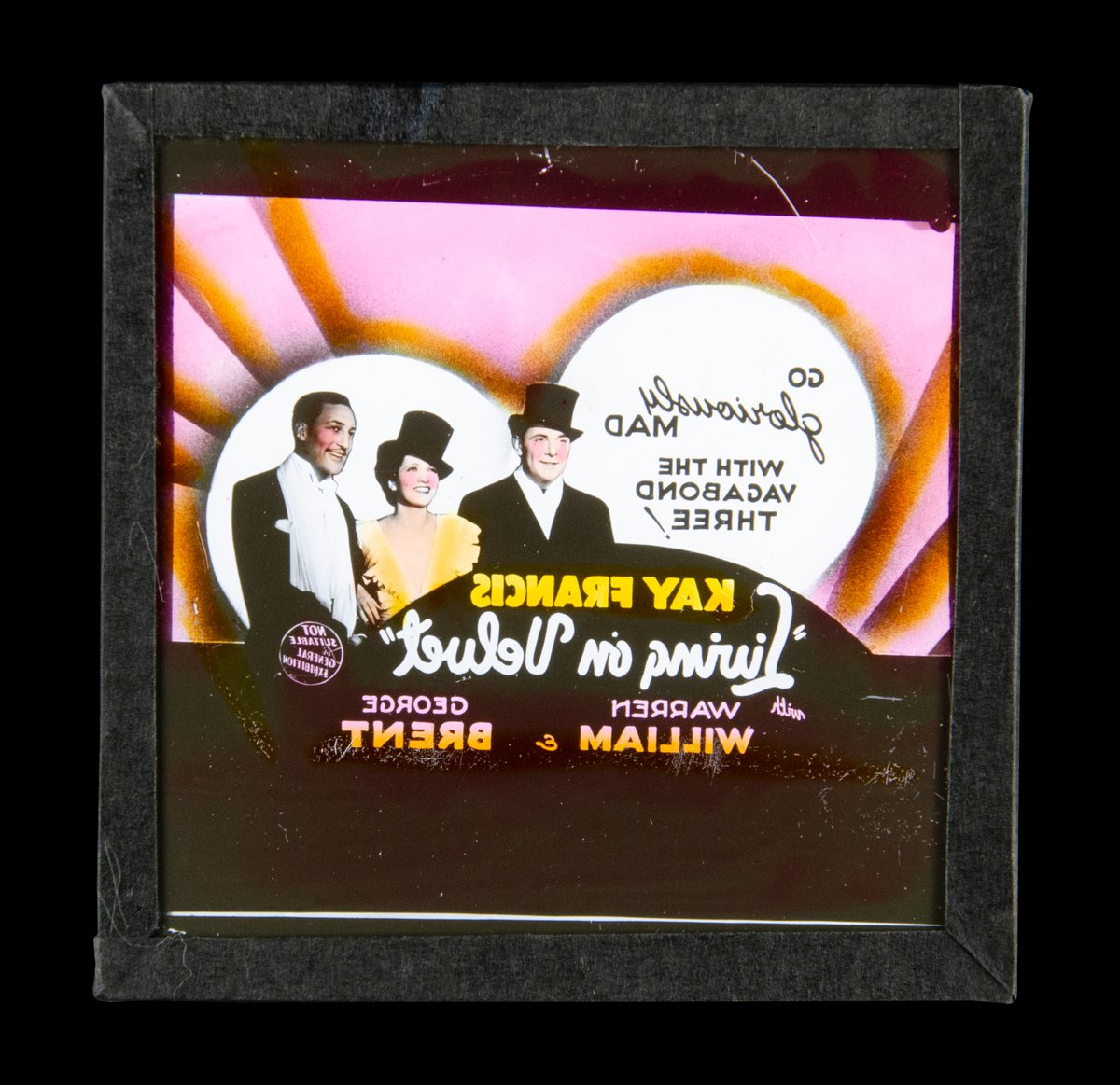 Glass Cinema slide which has the slide imagery with a monochromatic emulsion that has then been hand painted with coloured pigments or dye. TEXT on the slide reads: Go gloriously mad with the Vagabond Trio Kay Francis Living on Velvet with Warren William & George Brent Not suitable for general exhibition.