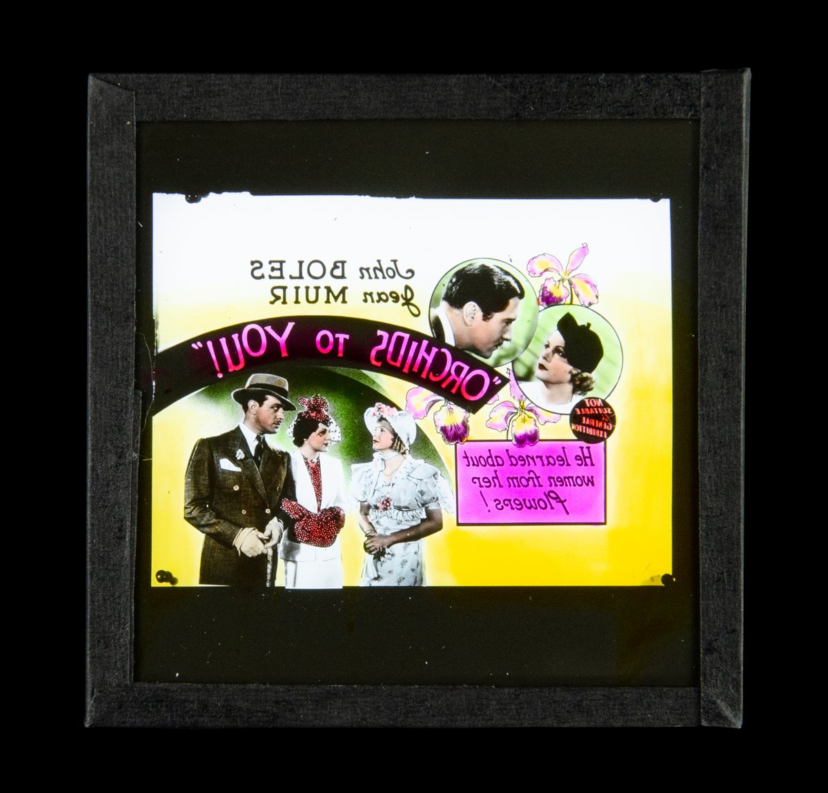Two glass sheets: one glass only and the other with slide imagery which has a monochromatic emulsion that has then been hand painted with coloured pigments or dye. TEXT on the slide reads: John Boles Jean Muir “Orchids to You!” He learned about women from her flowers! Not suitable for general exhibition The two sheets of glass are held together using Gunn’s Slide branded tape: Gunn’s Slide, 9 Collins Place Melb. Cent. 2736,