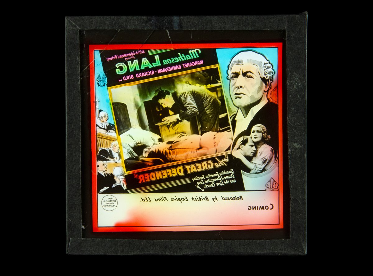 Two glass sheets: one glass only and the other with slide imagery which has a monochromatic emulsion that has then been hand painted with coloured pigments or dye. TEXT on the slide reads: British International Pictures present Matheson Lang Margaret Bannerman. Richard Bird The Great Defender Smashing Sensation - Seething Drama of Unrequited Love.. And the Law Courts! Released by British Empire Films Ltd Not suitable for general exhibition. Coming It looks as if handwritten text has worn away as there are very faint black marks remaining.