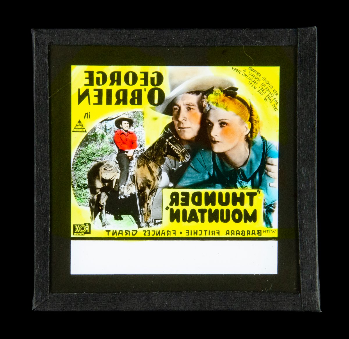 Two glass sheets: one glass only and the other with slide imagery which has a monochromatic emulsion that has then been hand painted with coloured pigments or dye. TEXT on the slide reads: Red-blooded adventure and colourful romance in this zane grey thrilling story of the west. George O’Brien in Thunder Mountain with Barbara Fritchie Frances Grant for general admission