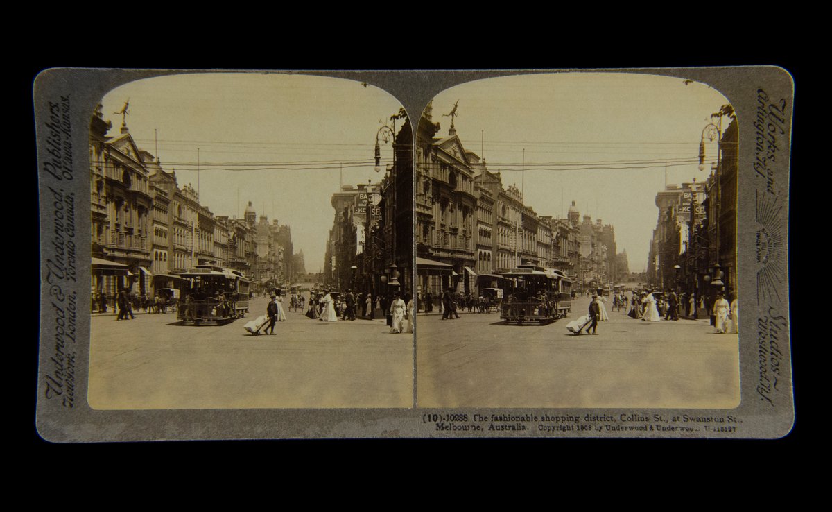 Stereoview card: The fashionable shopping district, Collins St., at Swanston St., Melbourne Australia, © 1908 by Underwood & Underwood, U.S.A., #10238, U-113127