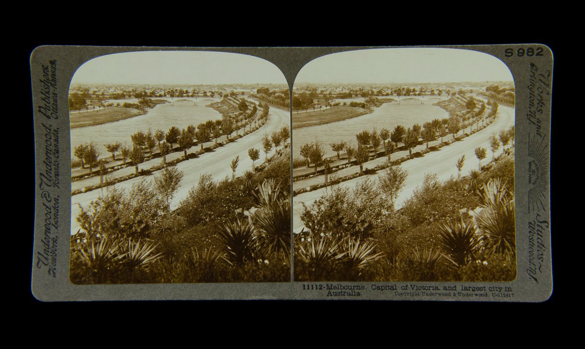 Stereoview card: Melbourne, Capital of Victoria, and largest city in Australia [view of Anderson Street Bridge and Alexandra Avenue from the Botanical Gardens], © by Underwood & Underwood, U.K. & U.S.A., #11112, U-113417, S982