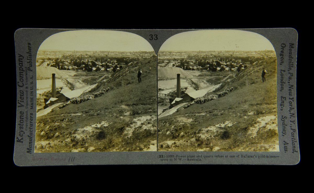 Stereoview card: Power plant and quartz refuse at one of Ballarat’s gold-mines, The Keystone View Company, © by Underwood & Underwood, U.S.A., #10261, position 33