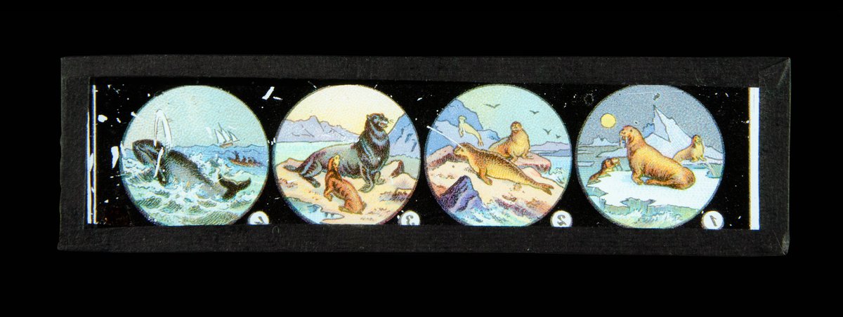 There are five parts to the Sea Life slides, each slide has 4 images. These small slides have red sealing tape around the edges. These slides form part of The Empire Magic Lantern Outfit with removable chimney and internal wooden block. The lantern is housed in original box with metal handle, and internal red and blue graphic for: The Empire Magic Lantern Outfit. 20 glass slides in custom box, length of textile to keep box shut, 2 small empty boxes which act to store slides in a snug manner.