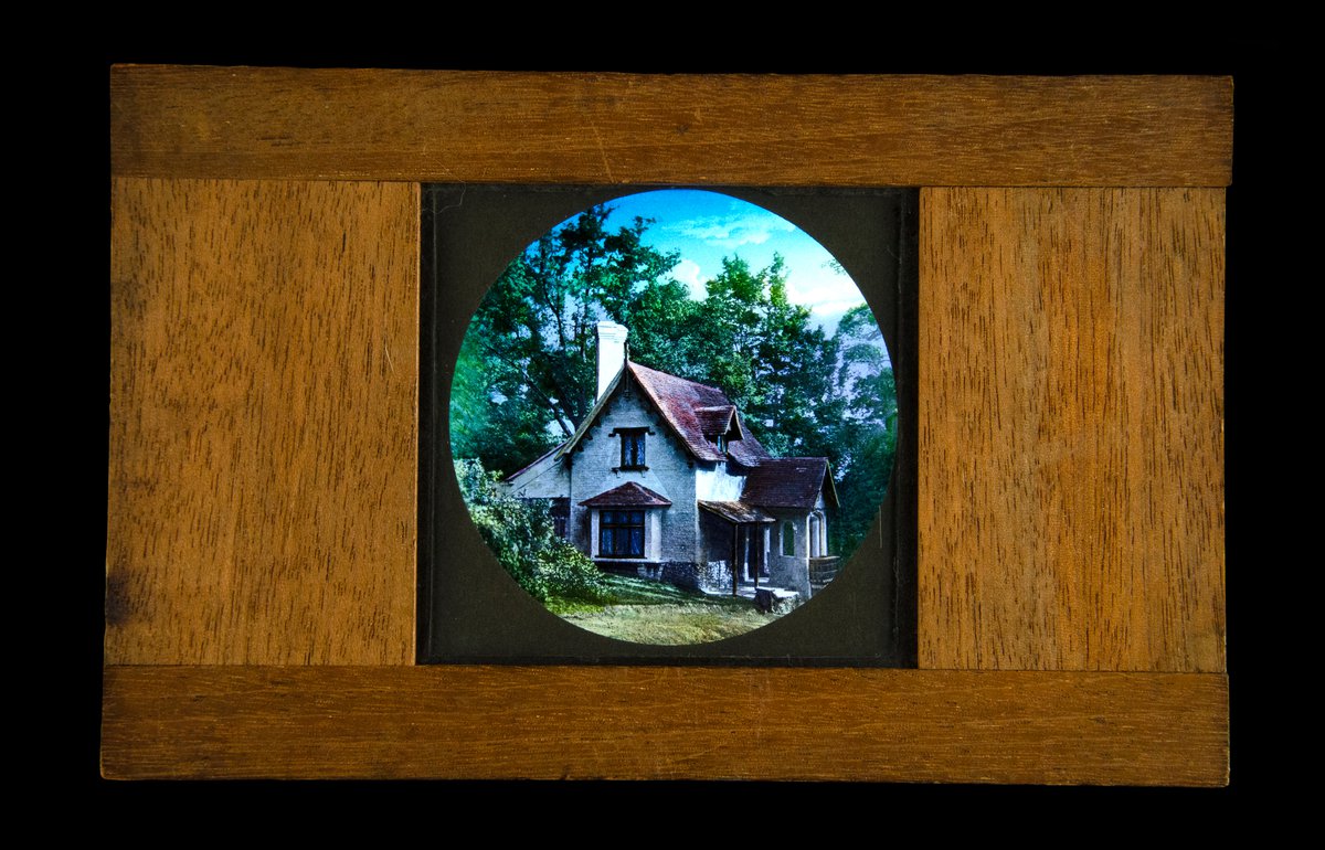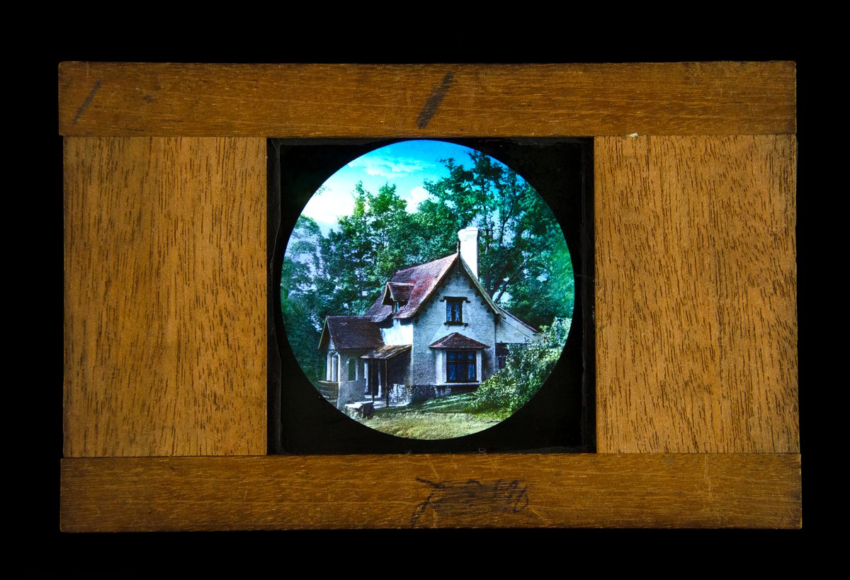 Magic lantern slide with wooden frame. The coloured slide shows a English style house and gardens. Several pencil marking on the wood. On the underside, ‘57’ has been written in a thick white ink.