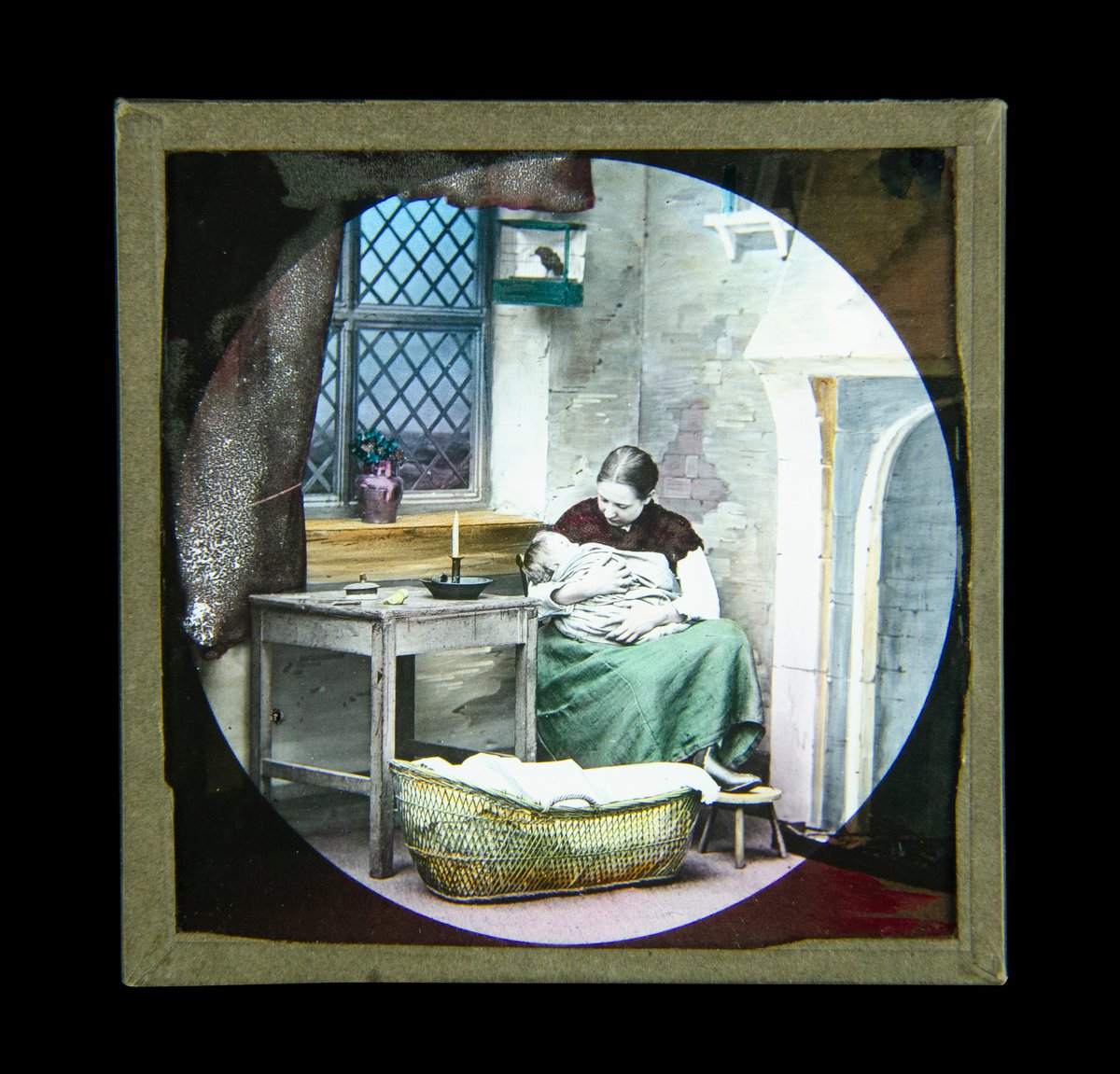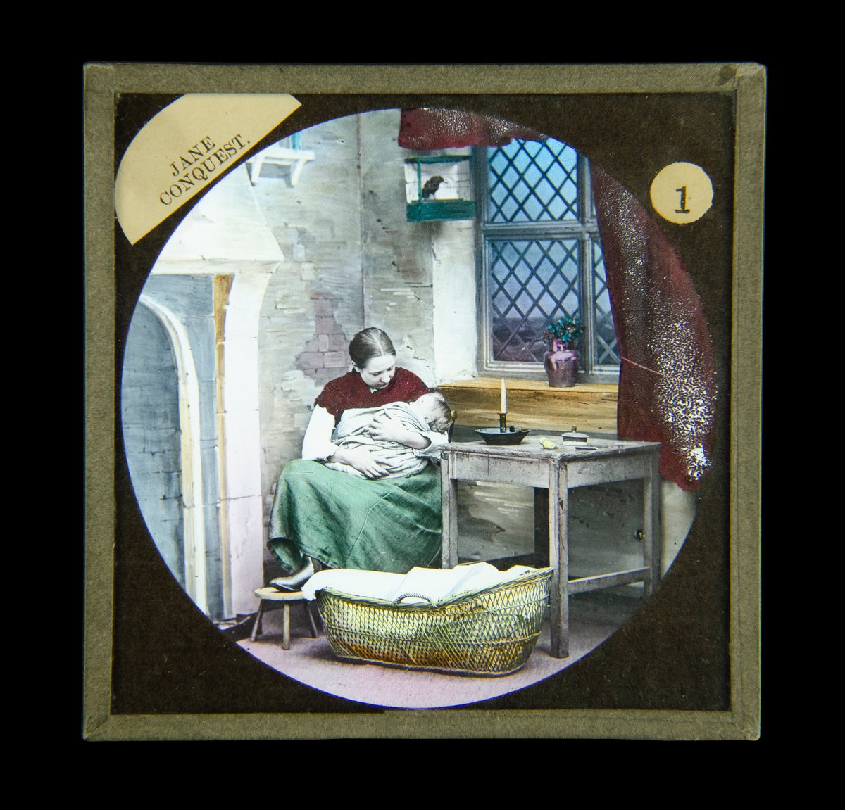 Narrative for slide: “At these words the curtain went up to disclose Jane Conquest, a strong featured, sturdy young woman in a red shawl, seated with her sick child on her lap by a cheerless grate in a cottage interior with a Gothic stone hearth and a latticed window. The tearing, whistling crescendo and diminuendo of a great storm almost drowned the voice of the narrator and a distant, bloodcurdling cry.”