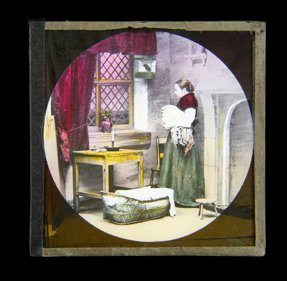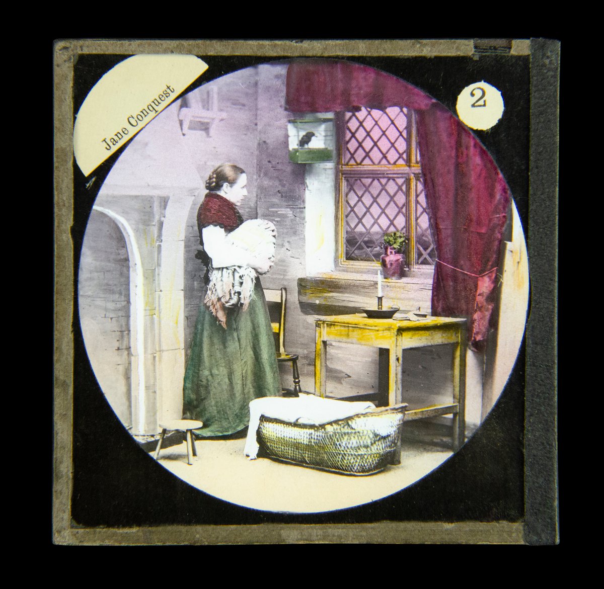 Narrative for slide “The window was crimsoned with the flickering reflection of a fire, and the next slide, flashed on with lightning speed, showed Jane starting up to the casement.”