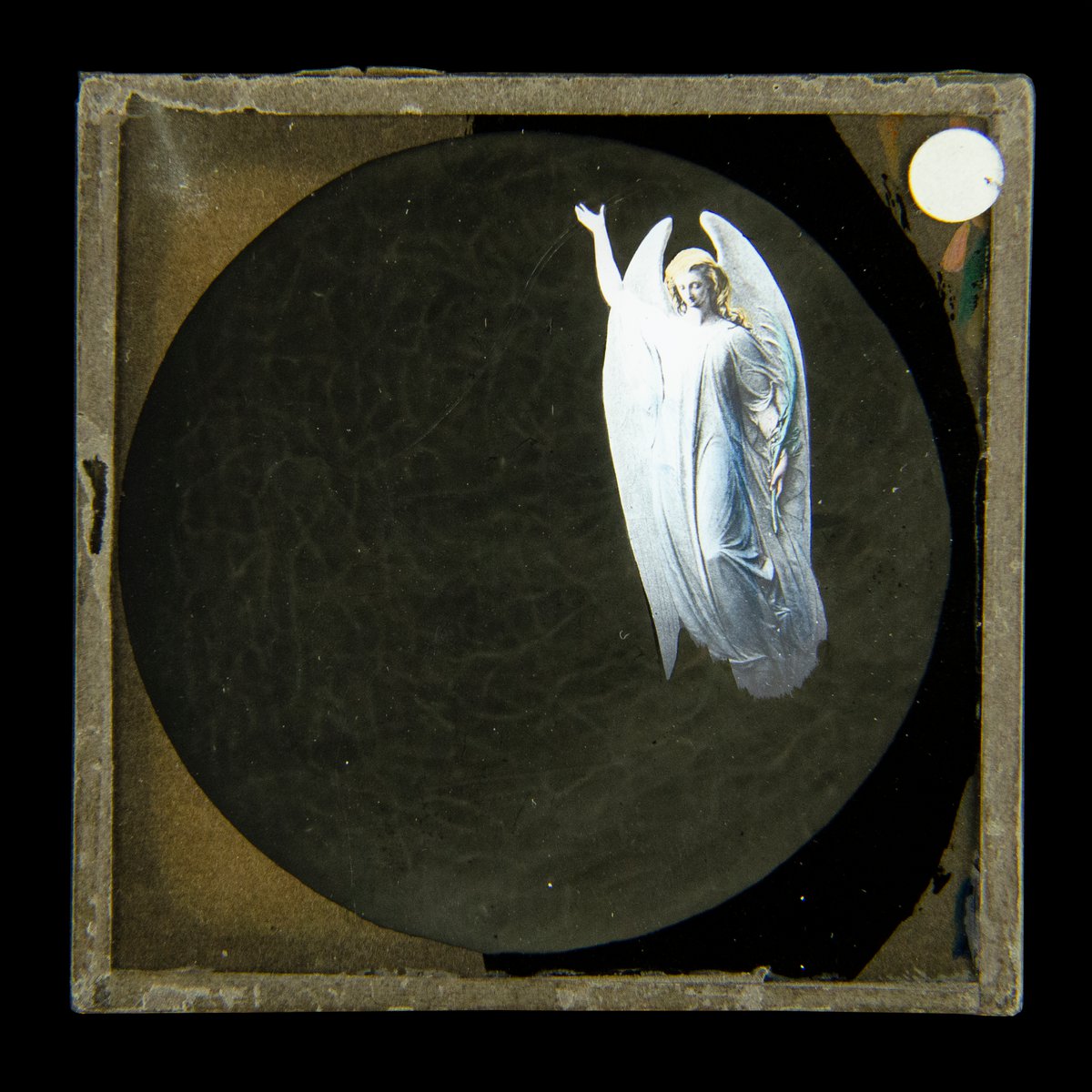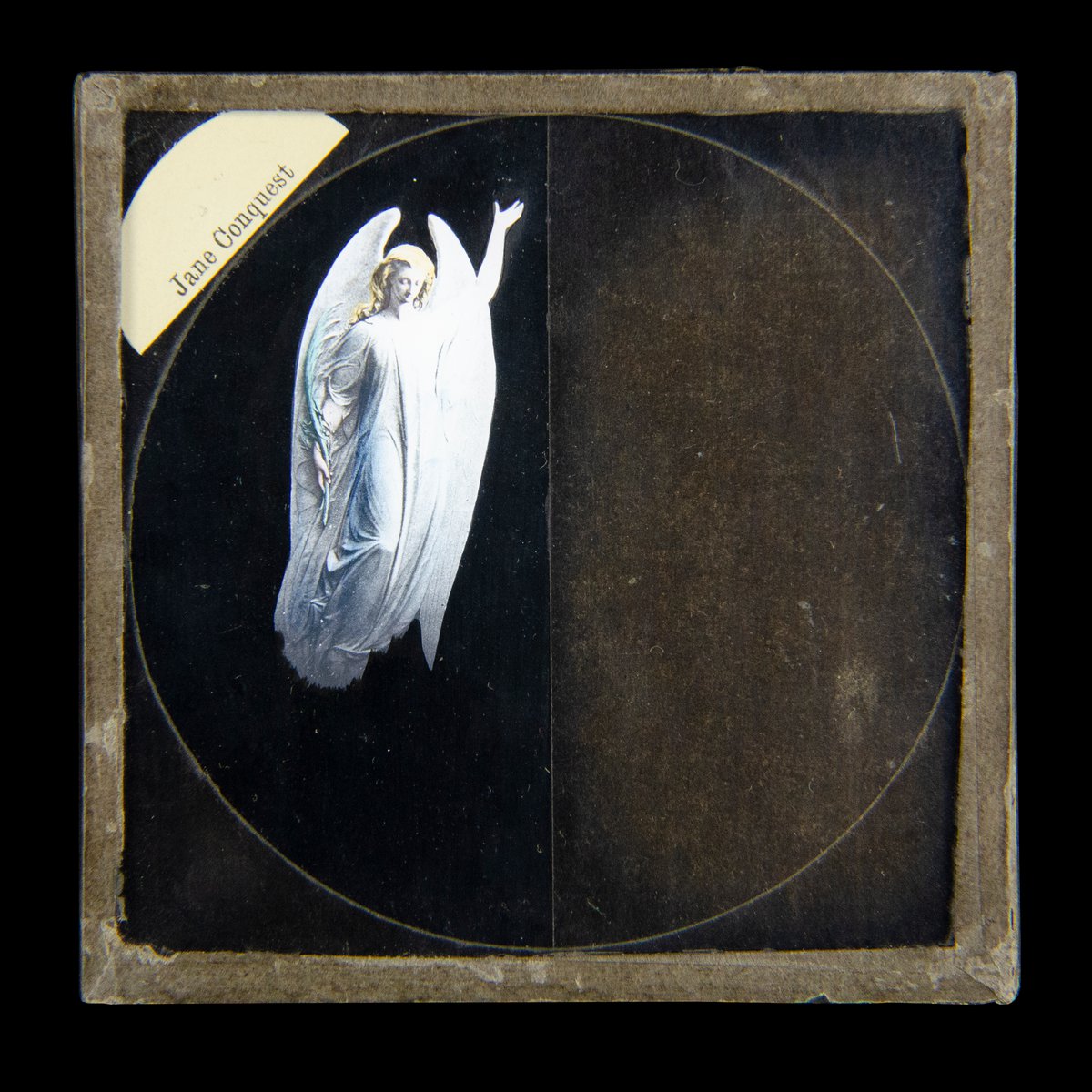 Note: With a biunial lantern projector, LN179801 Jane’s Conquest 6/17 ‘Angel’ was used to show an angel appearing at Jane’s shoulder (LN179800 Jane’s Conquest 5/17 Woman on knees with baby in bassinet and LN179812 Jane’s Conquest 17/17 Husband and Wife with Baby in bassinet. ”