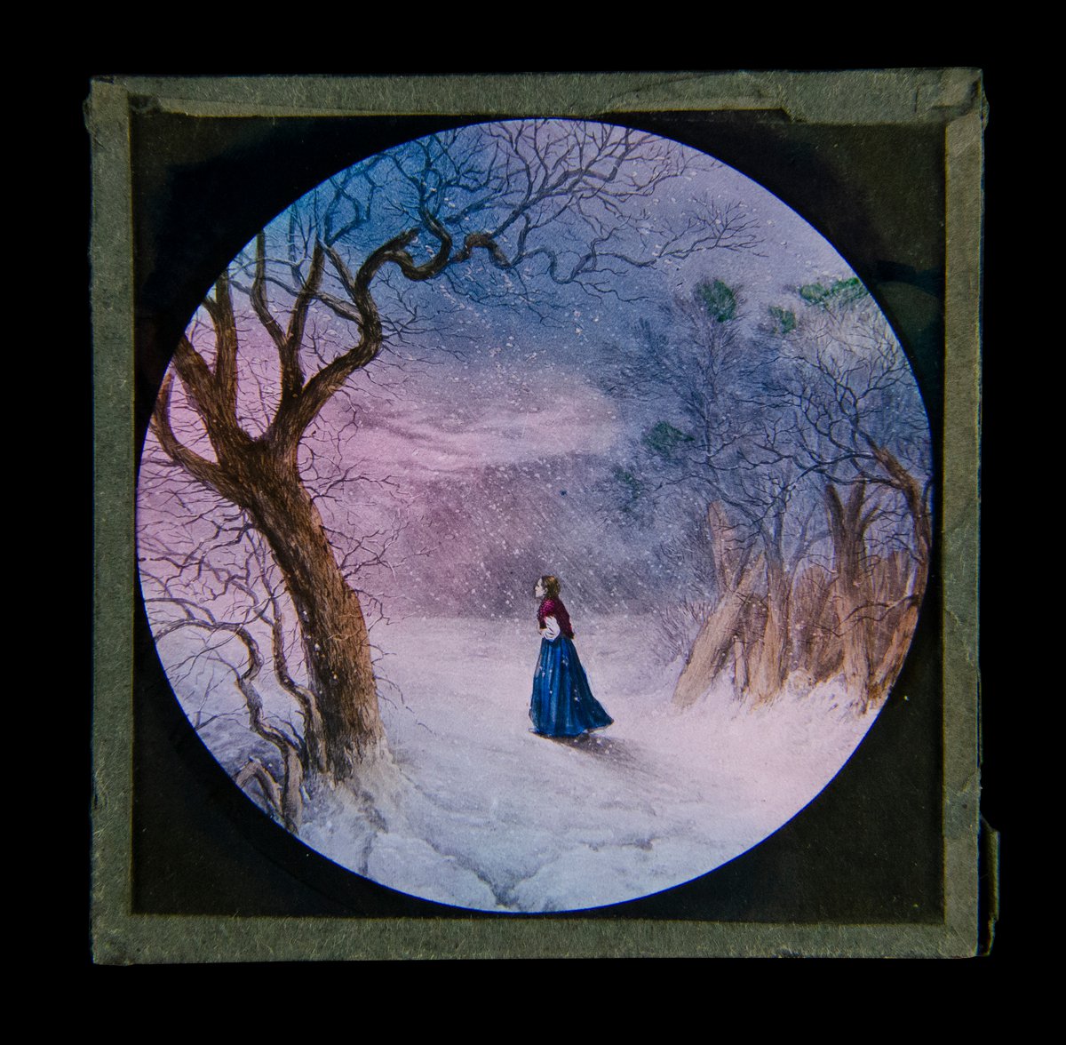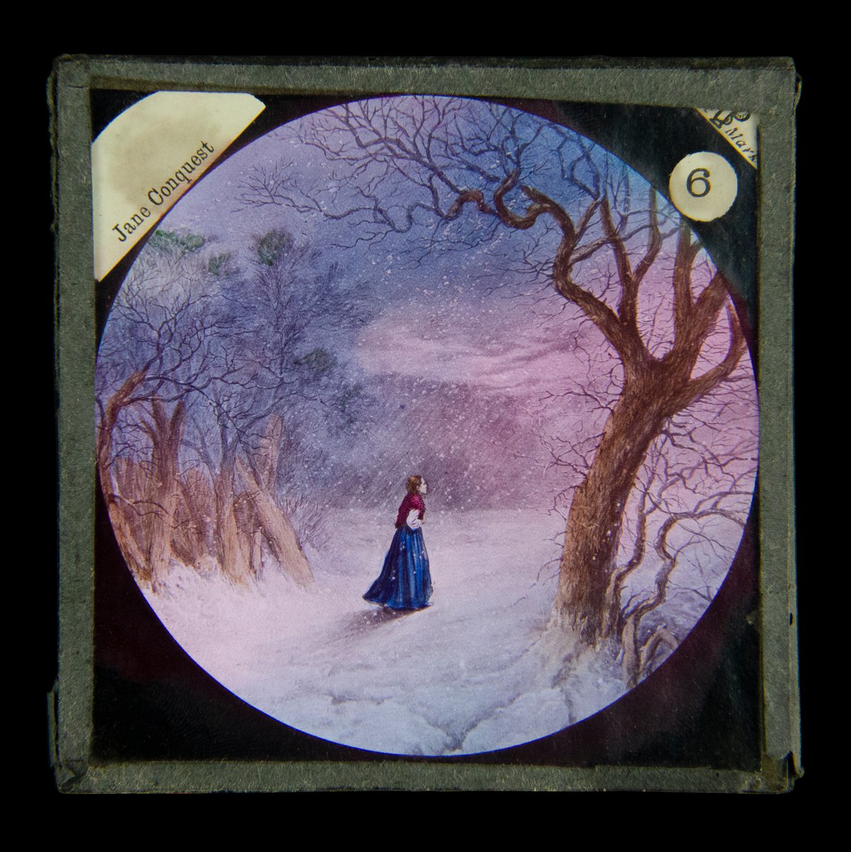 Narrative for slide: “She fought her way at last through blinding snow to the church on the cliff above the burning vessel (two spectacular slides in which the minute figure of the heroine is seen; first in a vast, hostile, white landscape ……..”