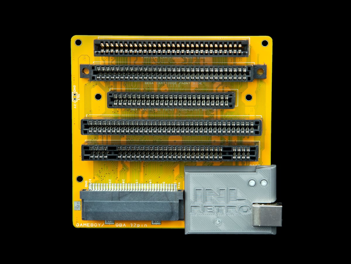 printed circuit board, plastic and metal connectors, 3D printed connector mount, cable plastic/rubber and metal wire, clear rubber feet on reverse