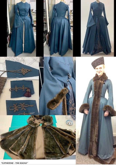 The fact that Peter is a more traditional ruler than Catherine is apparent in Emma Fryer’s costuming mood boards. Even the poses in the reference images for Catherine’s birthday dress are exuberant, featuring a daring 2008 runway look from Christian Lacroix, and the Rococo painting The Musical Contest (1755), by Jean-Honoré Fragonard. They are bold, bright, unapologetically feminine - in direct contrast to the aggressive animal prints and slogans of Peter’s hunting board. On the Dacha costume board, several historical illustrations are featured, and the simplicity of Catherine’s Dacha board suggests her costume was designed to match.