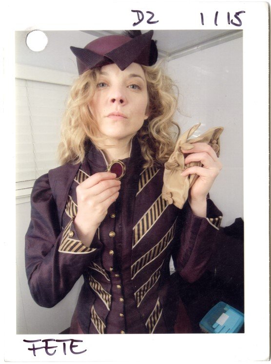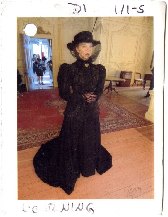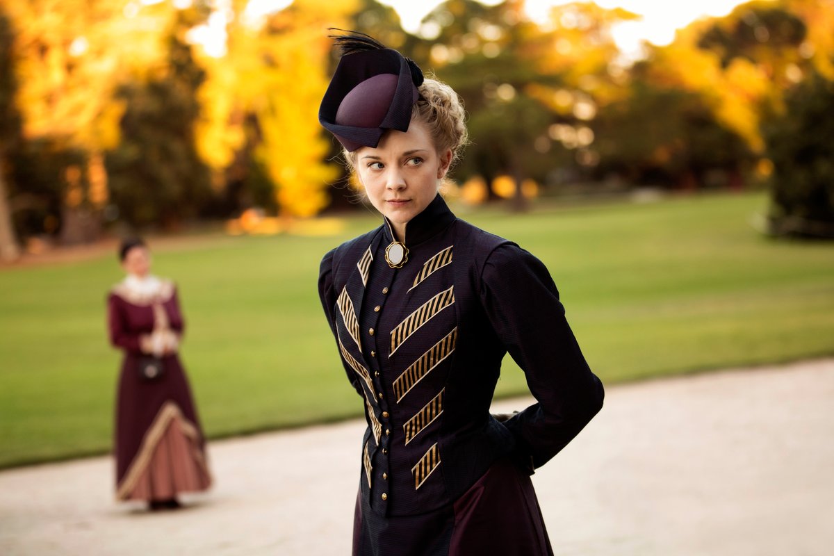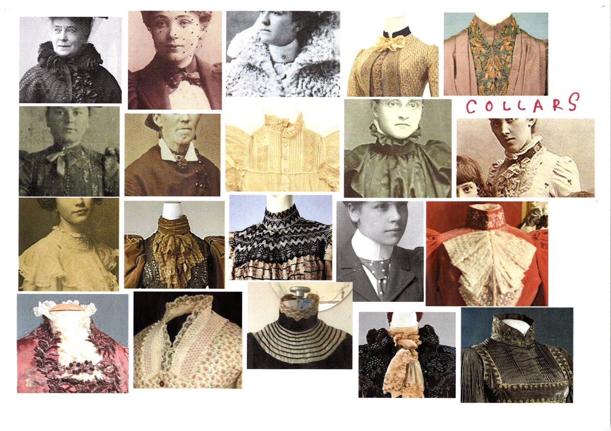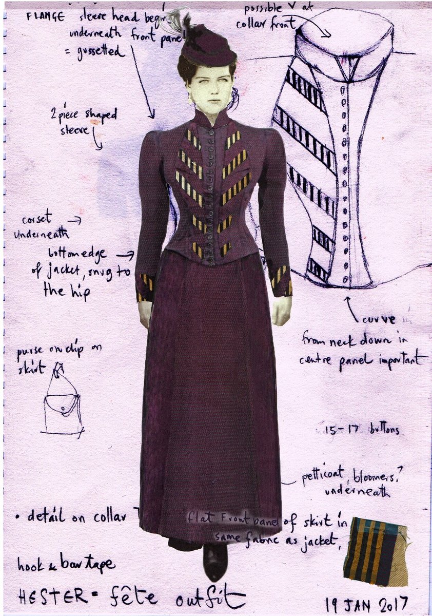 Costume designer Edie Kurzer used a combination of vintage garments and original pieces for the Picnic at Hanging Rock (2018) costumes. As we can see from this costume sketch, Mrs Appleyard’s purple fete outfit was fabricated from scratch, while the reference materials illustrate some of the details that went into Edie Kurzer’s design of the garments. The costume sketch and accompanying mood board of Victorian-era collars show how Kurzer gathered a body of historical reference points while crafting the original garments, like the stunning purple and gold jacket that goes with Mrs Appleyard’s fete costume. On this reference board, there are several designs that closely mimic the high, V-shaped collar of the final jacket.