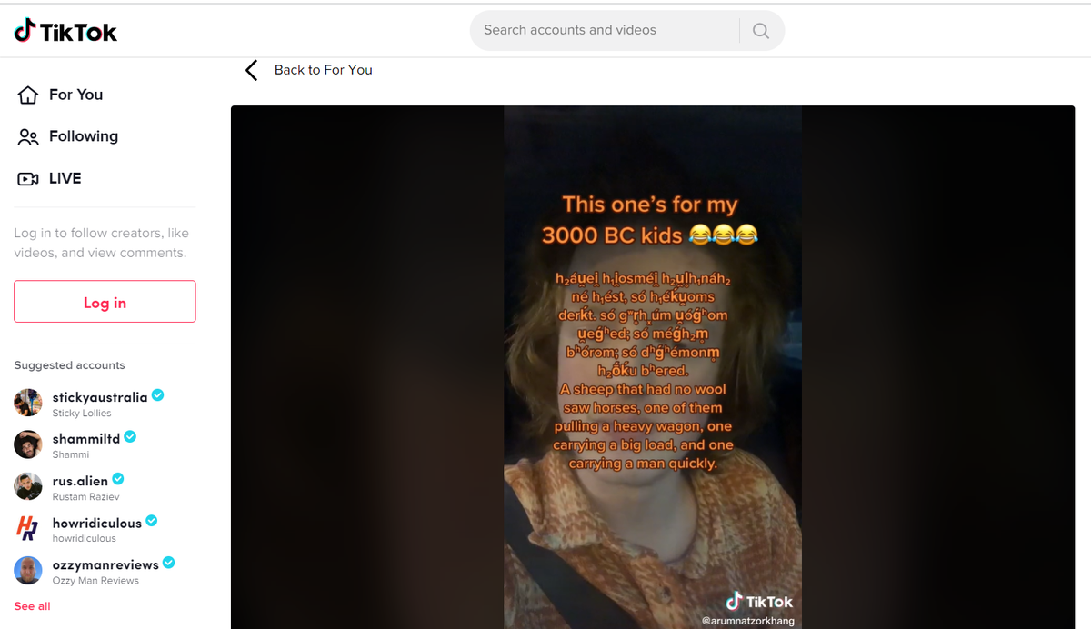 Tiktok can be educational - but not in the way you might think. Information spreads not just through researched videos, but also levity, memes, and irreverent, lo-fi video content that entertain and provoke curiosity. Questions like ‘What is a phrase that someone born after 2000 wouldn’t understand’ usually garner stitched video responses from people enthusiastically reminiscing about ‘the good old days.’ Here instead, linguist Arum Natzorkhang pokes fun at the trend by responding in Proto-Indo-European, a reconstructed language which is hypothesised to be the common ancestor to all Indo-European languages.
