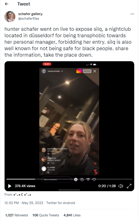 Trans actor and model Hunter Schafer went live on Instagram to expose Silq, a nightclub in Düsseldorf, for refusing her assistant entry because she is trans. Schafer connected with up to 30.1K of her followers in real time to call out the club as “not safe for transgender people”. @schaferfiles, a Twitter fan account for the actress, ensured that Schafer’s broadcast could be accessed beyond the live stream, screen recording and reposting the video to Twitter. The viral nature of Schafer’s video demonstrates the power of social media as a tool for activism.
