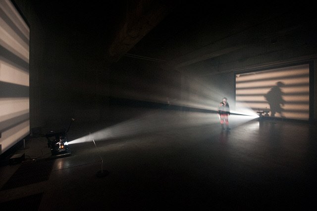 To make this artwork, Rhodes composed a ‘score’ comprised of drawings that were printed onto filmstrip. They form abstract patterns of black and white lines onscreen. As the bands of light and dark pass through the projector they are ‘read’ as audio, creating an intense soundtrack. This creates a direct relationship between what we see and what we hear. The crossing projection beams achieve a sculptural quality within the space, encouraging us to move through and interact with the light beams. This is an early example of expanded cinema, in which viewers are both spectators and participants.