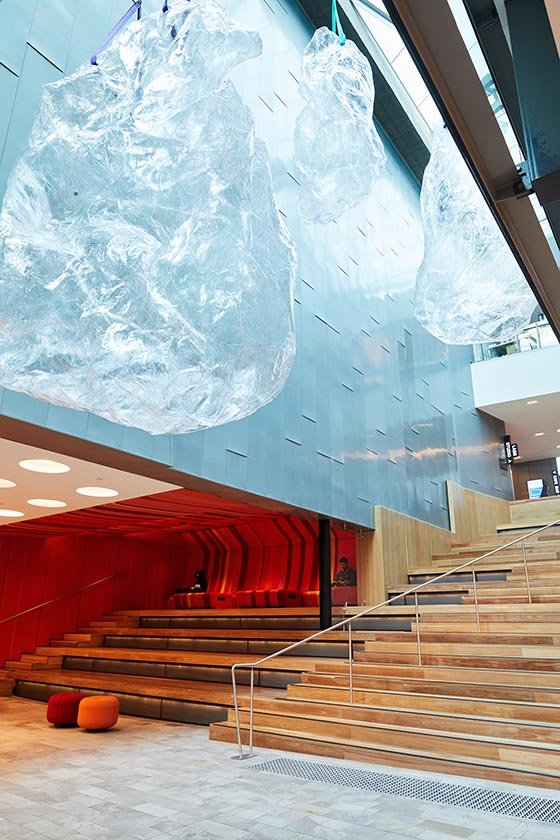 A family of translucent and ethereal bodies glide through the air, multiplying as their reflections spread across windows and glass surfaces. Depending on your perspective, and how they absorb and refract the light, they appear solid or intangible, flicking between visibility and invisibility. After all, these are “empty sculptures”, “shapes of nothing” according to artist Mikala Dwyer. But through the simple phenomena of light, material and form, and by contorting scale, Dwyer lets us imagine ourselves somehow drawn through them, like the atrium windows drawing the outside light, that elemental medium that has endlessly fascinated artists.