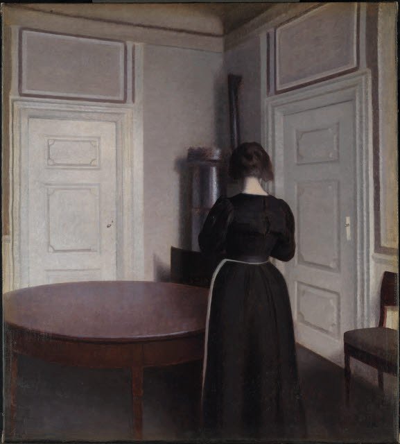 Vilhelm Hammershøi (1864–1916) is known for his subdued portraits and meditative interiors which record the details of his everyday life. William Rothenstein (1872–1945) was similarly concerned with portraying domestic environments. In his portraits of family and friends, he gives the surrounding spaces as much attention as the figures. Both artists took great care in accurately portraying light, from the highlights on the figures’ hair, skin and clothing in Rothenstein’s paintings to the effects of light and shadow on the walls and floor of Hammershøi’s home.
