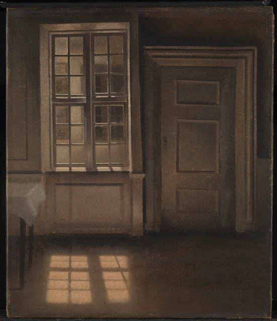 Vilhelm Hammershøi (1864–1916) is known for his subdued portraits and meditative interiors which record the details of his everyday life. William Rothenstein (1872–1945) was similarly concerned with portraying domestic environments. In his portraits of family and friends, he gives the surrounding spaces as much attention as the figures. Both artists took great care in accurately portraying light, from the highlights on the figures’ hair, skin and clothing in Rothenstein’s paintings to the effects of light and shadow on the walls and floor of Hammershøi’s home.
