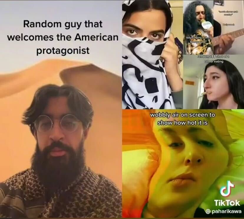 Hollywood has a long history of perpetuating stereotypes and appropriating cultures. Aslan Pahari – known for his satirical anthropological content – skewers the noble and wise Middle Eastern guide who typically leads American ‘heroes’ through supposedly ‘exotic’ lands. By combining tired tropes of Arabic culture – sand dunes, ‘wobbly air’, ‘traditional’ singing – he exposes Hollywood’s uniformed attitude towards non-white characters. Recently, Arabic and Islamic imagery and language was appropriated in Dune (2021), yet the film featured no Middle Eastern or North African actors. By including videos from other users calling out stereotypes, Pahari also demonstrates there’s no single way to represent a people or culture.