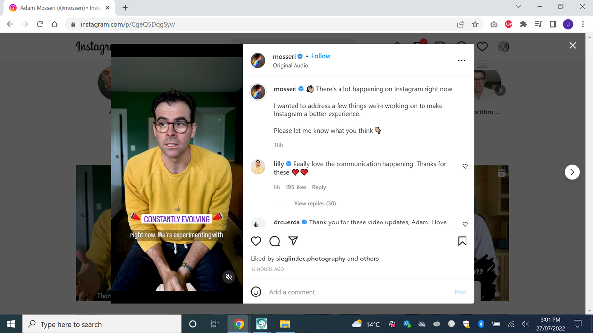 Digital screen recording of @mosseri's Instagram post