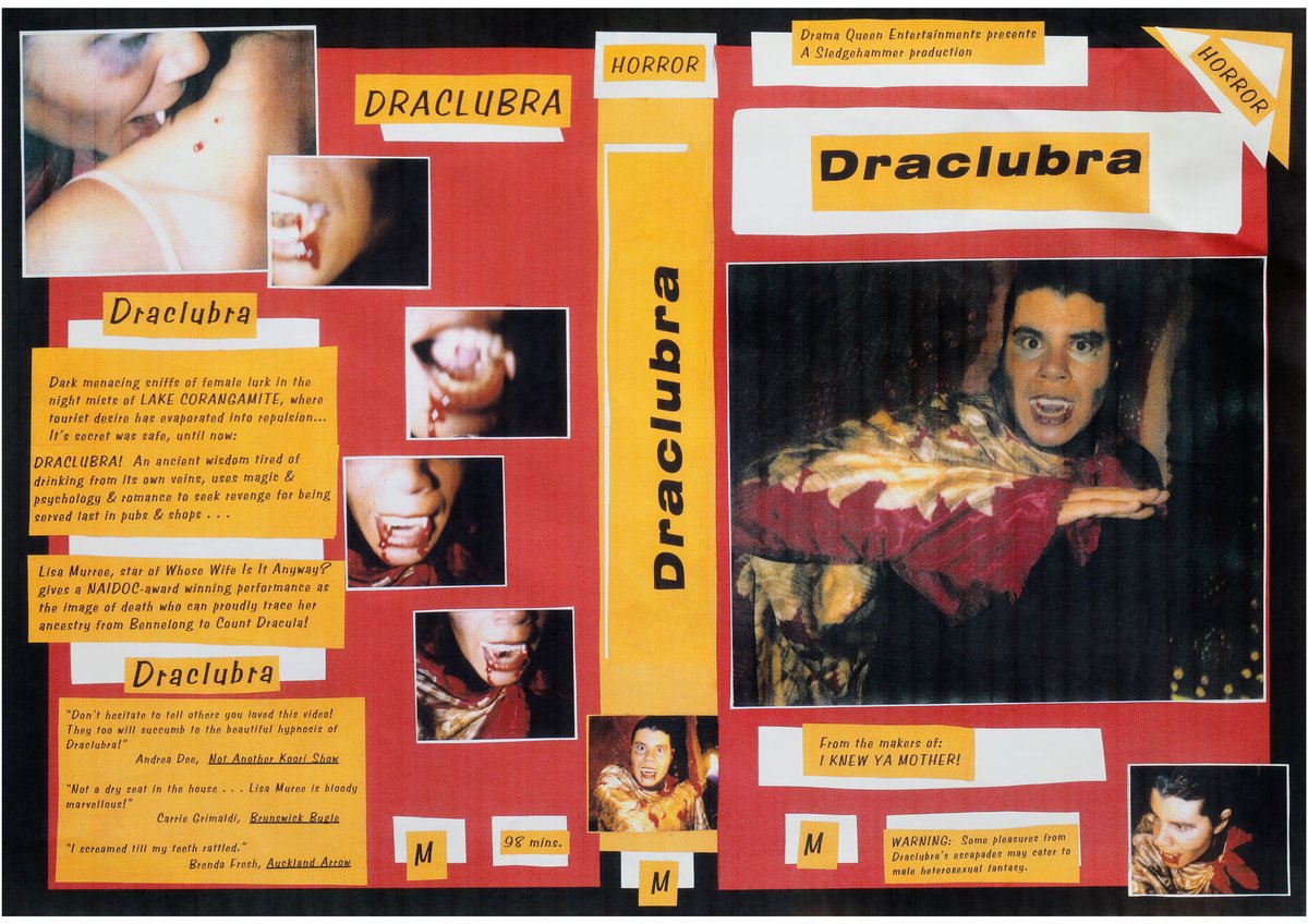 Miss Peach Blossom’s mighty sore and out to settle scores. She’s on the run, just like Little Miss Wonder, the con-artist kid beauty queen, while the ‘ancient wisdom’ Draclubra seeks revenge for being served last in the Lake Corangamite pub. Roles in movies were limited for Aboriginal people in the 1990s, so Destiny created her own plot lines and characters, bringing them to life on these VHS covers of imagined B-movies. In one satirical ‘review’, printed among the lurid blurbs and imagery, we’re told that a viewer ‘chuckled until she spit blood’. This combination of humour and horror demonstrates a key aspect of Destiny’s work – it’s as funny as it is confronting.